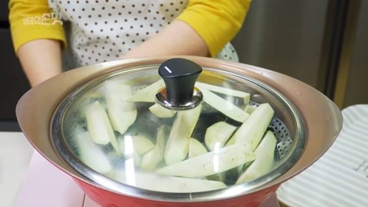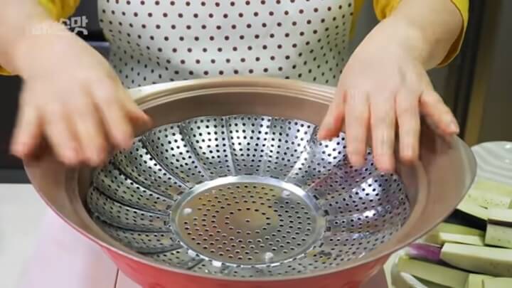 가지를 찜기에 넣고 3~5분 정도 쪄주세요.